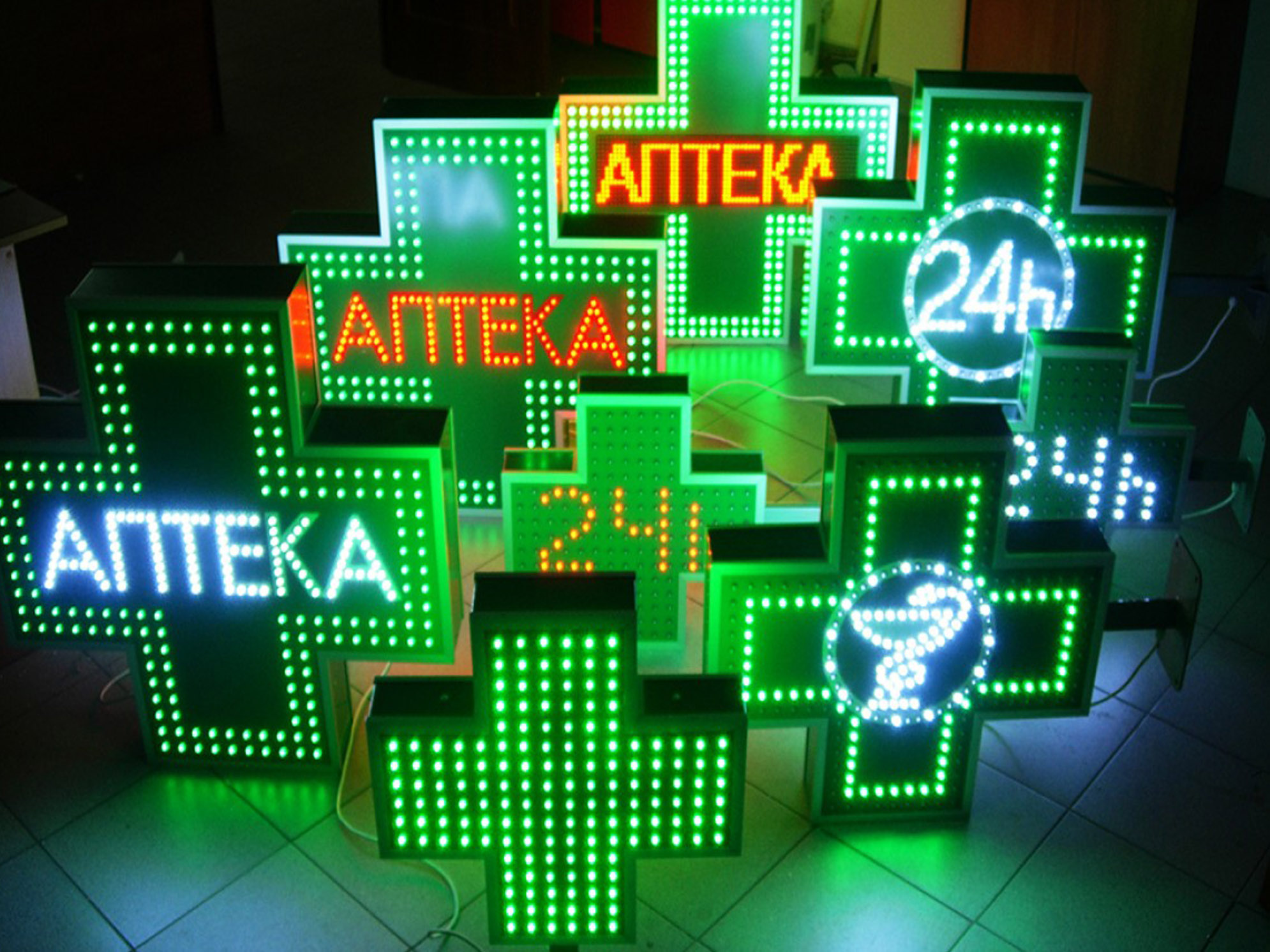 Как видим, существует большое количество аптечных крестов, которые используются для навигации и привлечения внимания к аптеке. Вместе с тем, в настоящее время особую популярность завоёвывают диджитал-аптечные кресты, состоящие из светодиодных панелей. Полагаем, что будущее за данными рекламными конструкциями.