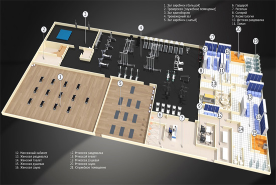 Примеры дизайна помещений фитнес-центра приведены ниже: