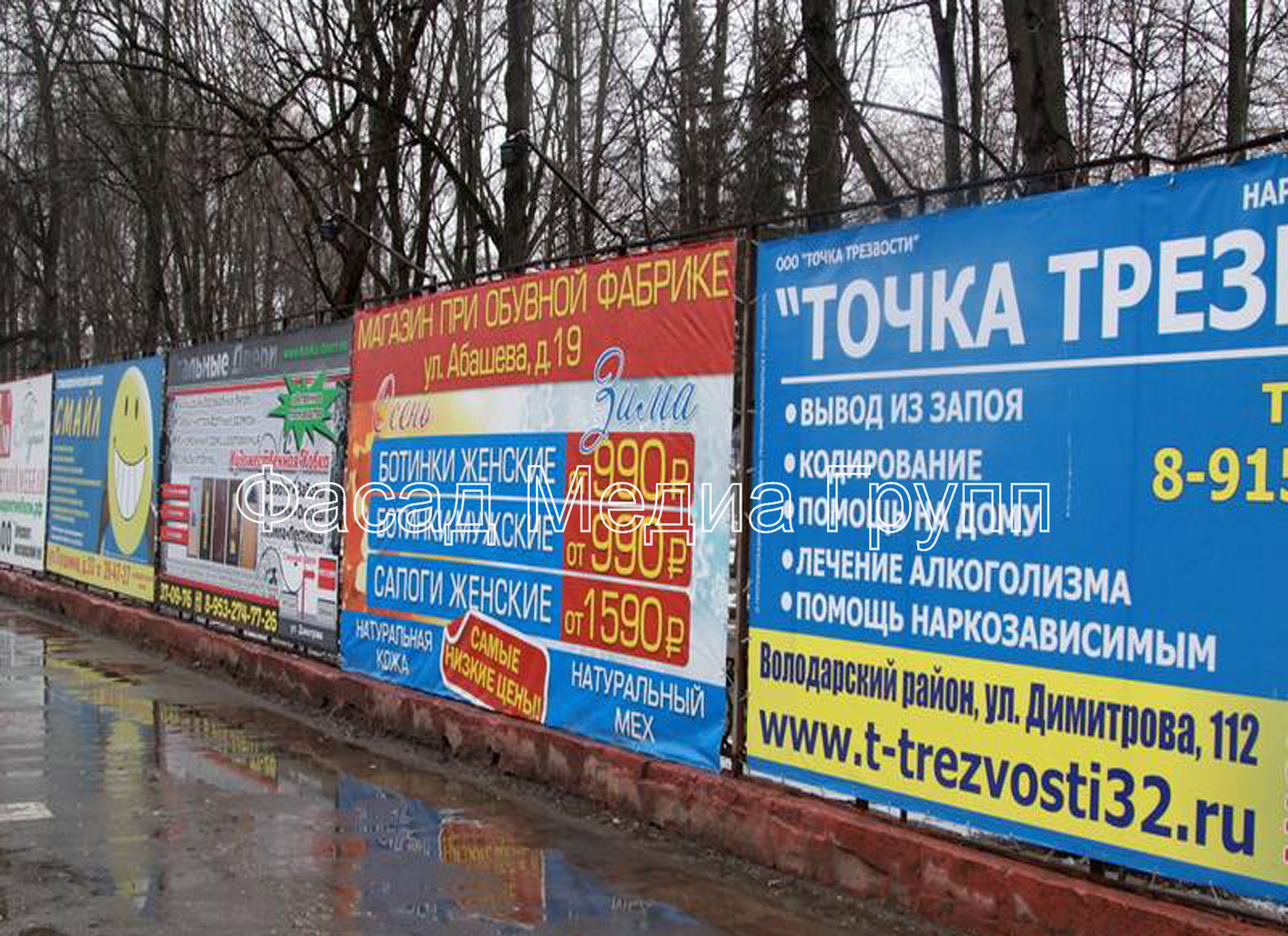 Размещая рекламу на заборах, вы сможете мгновенно охватить всех людей без исключения. В условиях городской среды размещение информации о компании на заборах является эффективным средством продвижения бренда организации, поддержания внимания к вашему бизнесу, привлечения новых клиентов и удержания старых покупателей и заказчиков. Именно заборы, установленные на улицах города, помогают горожанам увидеть необходимую рекламную информацию. Заборы способствуют быстрому распространению рекламной информации, хорошей заметности рекламного материала, делают рекламную кампанию еще более эффективной, а бизнес прибыльным. Для размещения рекламы на заборах обращайтесь в рекламное агентство «Фасад Медиа Групп». Будем рады сотрудничеству.