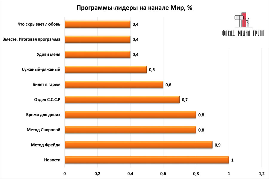 Популярность телеэфира на «Мир» приводит к ежегодному увеличению спроса на рекламное время. Для привлечения клиентов из разных регионов России, увеличения процента продаж, повышения имиджа компании и узнаваемости бренда – размещайте рекламу на «Мир». «Мир» – это проверенный и востребованный канал для размещения рекламы на чебоксарском ТВ. Для размещения рекламы на телевидении обращайтесь в рекламное агентство «Фасад Медиа Групп». Будем рады сотрудничеству.