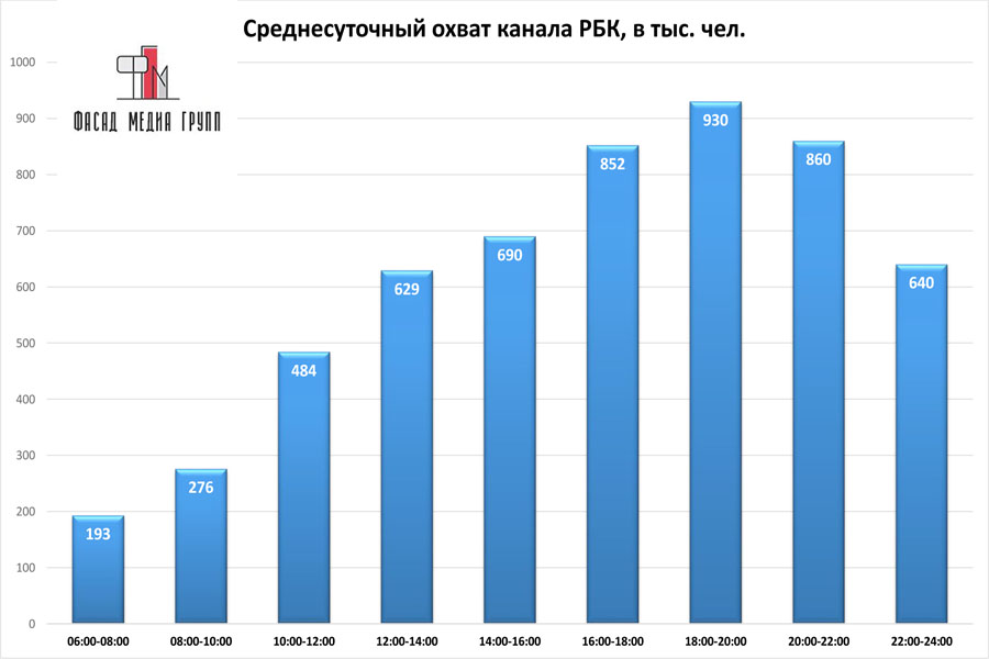 Популярность телеэфира на «РБК» приводит к ежегодному увеличению спроса на рекламное время. Для привлечения клиентов из разных регионов России, увеличения процента продаж, повышения имиджа компании и узнаваемости бренда – размещайте рекламу на «РБК». «РБК» – это проверенный и востребованный канал для размещения рекламы на чебоксарском ТВ. Для размещения рекламы на телевидении обращайтесь в рекламное агентство «Фасад Медиа Групп». Будем рады сотрудничеству.