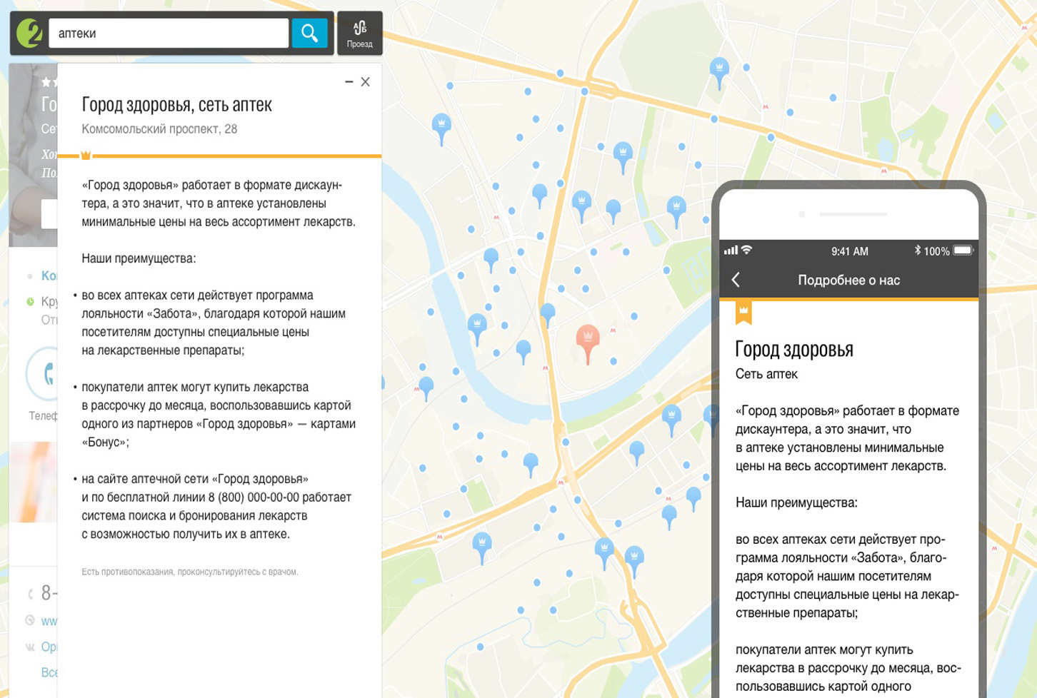 В 2ГИС (Двагис, ДубльГис) доступна геореклама – контекстная и медийная реклама, которую видит пользователь с учетом географии его интересов или текущего местоположения.