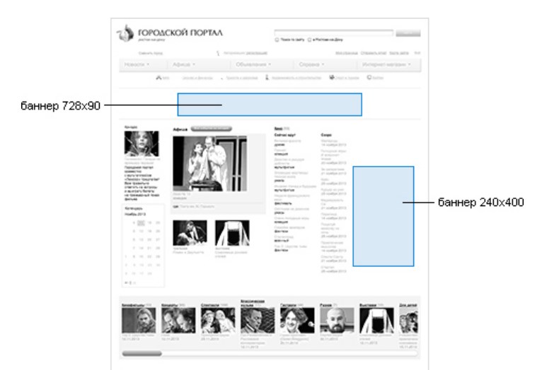На сайте городского интернет-портала размещаются баннеры различных размеров. Так, самыми распространенными являются следующие форматы: