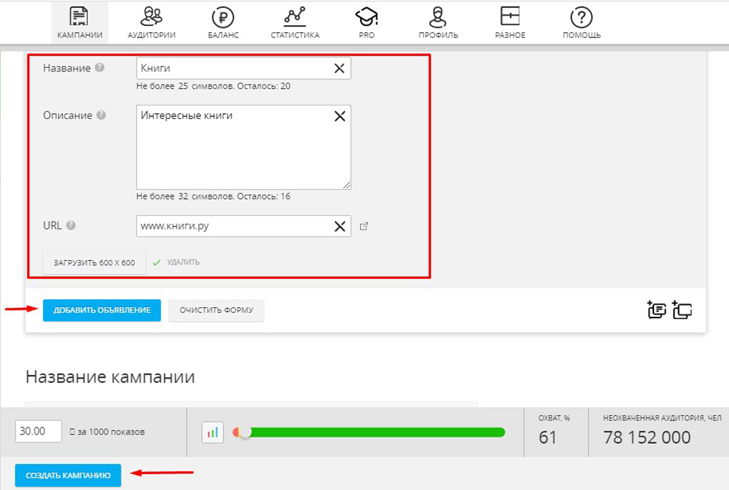 10) нажмите кнопку «ДОБАВИТЬ ОБЪЯВЛЕНИЕ», а после «СОЗДАТЬ КАМПАНИЮ».