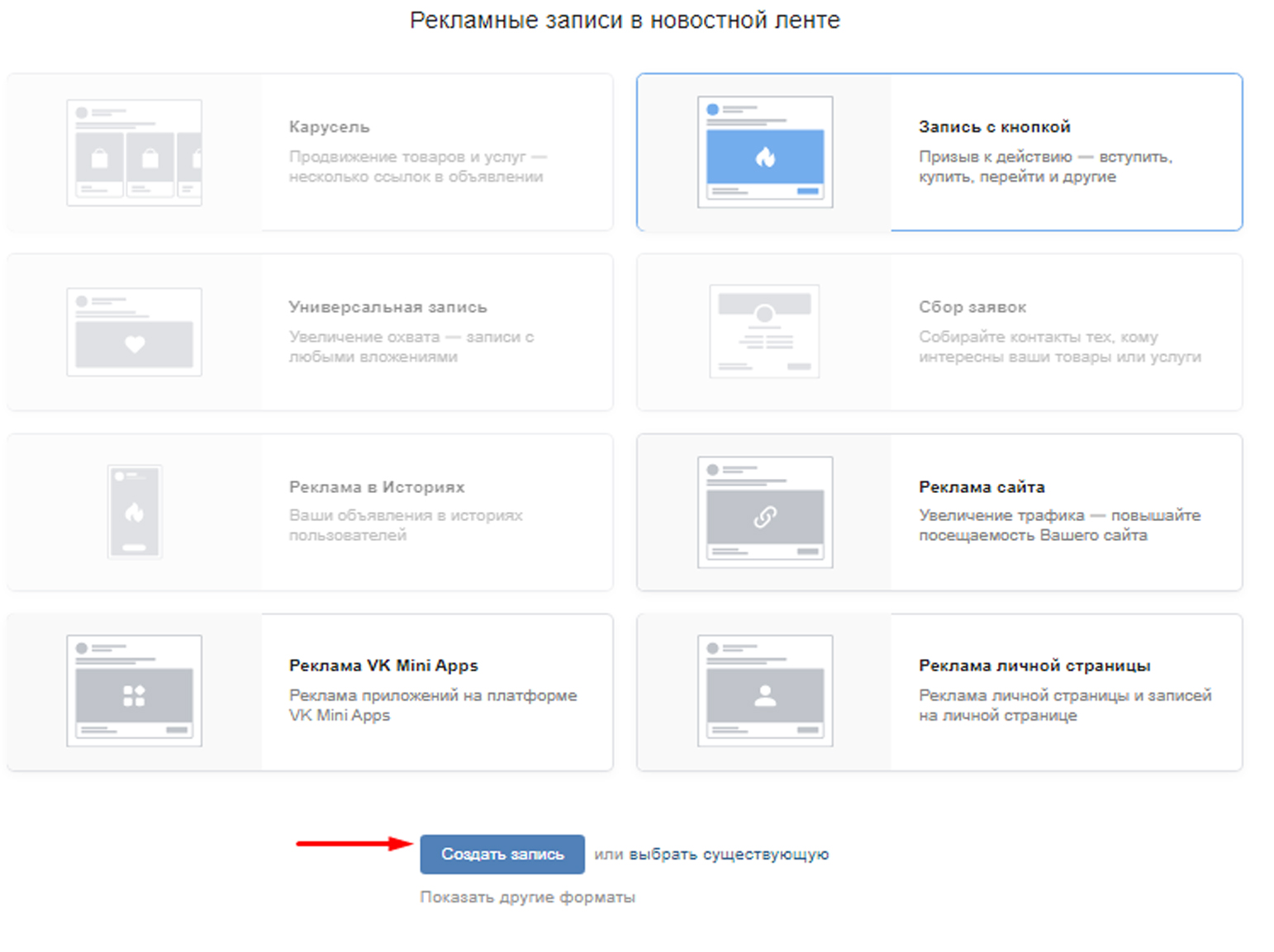 Помимо указанных рекламных форматов ВКонтакте предлагает выбрать дополнительные виды рекламы:
