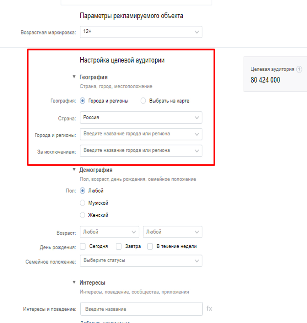 2) произведите настройку целевой аудитории: укажите страну, город. При этом ВКонтакте дает возможность указать на карте местонахождения вашего магазина. Если у вас несколько магазинов или офисов, то мы можете на карте отметить несколько объектов.