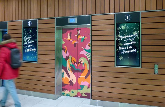 Можно сделать вывод, что при оклейке лифтовой кабины нами применяется как виниловая аппликация самоклеящейся пленкой, так и полноцветная печать на самоклеящейся пленке с последующей ламинацией и наклейкой на дверь кабины лифта.