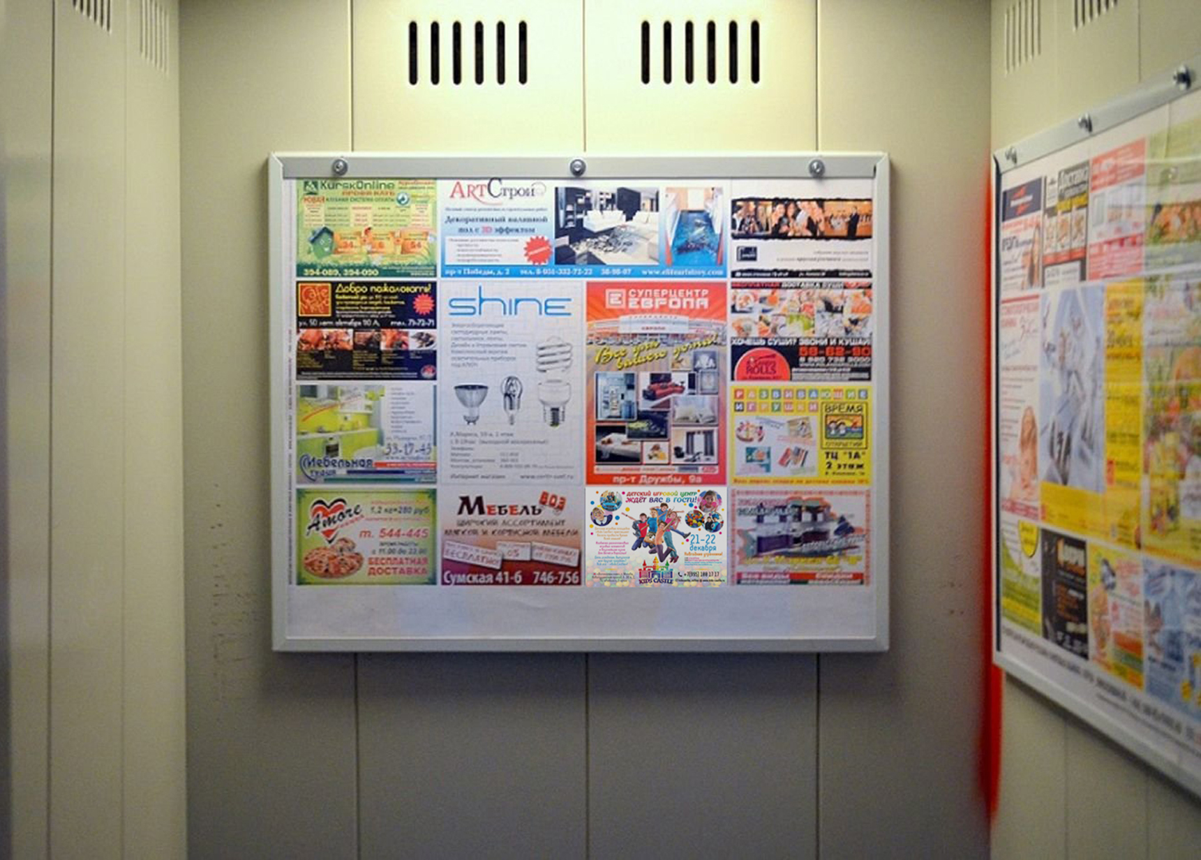 Монтаж рекламы в лифтах осуществляется по-разному в зависимости от того, какой рекламный материал размещается.
