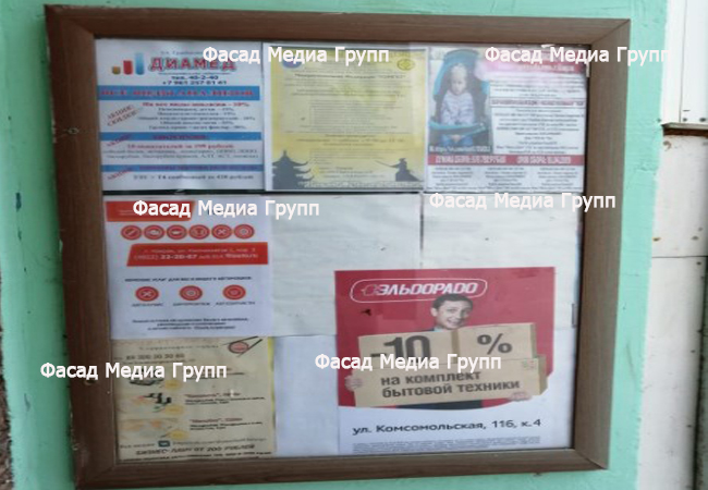 Многие дома в городах оборудованы информационными стендами, которые установлены в подъездах. Практически в каждом подъезде установлен информационный стенд , на котором размещаются рекламные материалы. Однако возникает вопрос: каким образом рекламные материалы монтируются на информационном стенде? Размещение рекламы в подъездах осуществляет наше рекламное агентство, т.к. у нас заключены соответствующие договоры с управляющими компаниями, ТСЖ и т.д. Специалисты Фасад Медиа Групп производят монтаж рекламы применяя специальные крепежные инструменты для информационного стенда.