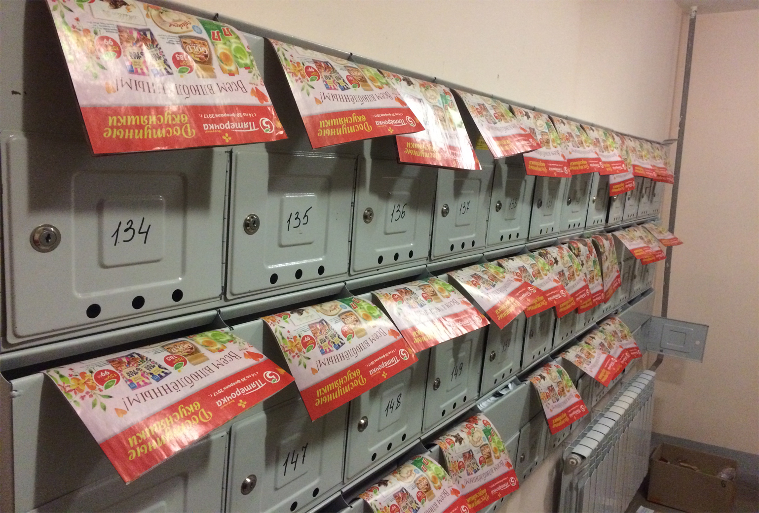 Реклама в подъездах отличается тем, что рекламные материалы располагаются на уровне глаз потенциального клиента или покупателя. Удачное расположение рекламы приводит к тому, что листовки, буклеты и другие форматы рекламы в подъездах хорошо видны и обеспечивают 100% читаемость со стороны жильцов дома.