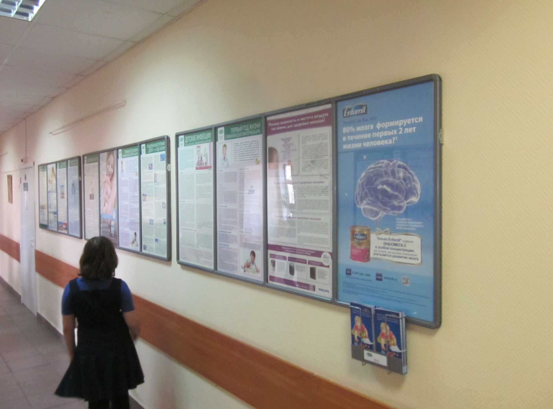 Реклама в поликлиниках отличается тем, что рекламные материалы располагаются на уровне глаз потенциального клиента или покупателя. Удачное расположение рекламы приводит к тому, что листовки, буклеты и другие форматы рекламы в поликлиниках хорошо видны и обеспечивают 100% читаемость со стороны посетителей.